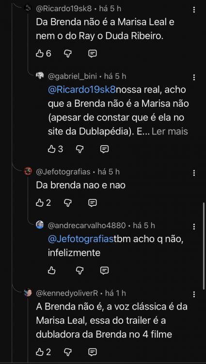 (5 horas atrás)Duke de Saturno Escreveu: Quem tá dublando o Shawn Wayans? E a pessoa q fala elu? Me parece o Rodrigo Nanal, como já havia comentado. Mas precisaria de uma cena maior pra “bater o martelo”, pq também me lembrou o Cassiano Ávila. A outra pessoa me parece a Maíra Paris. (7 horas atrás)Joseph Escreveu: o Duda devem chamar no filme, ele tem boa parceria com a Unidub. Mas acho valido ja reclamar no youtube e no dublagembra pra ficarem sabendo que queremos ele. Sobre o Ghostface, preferia q fosse o Moreno, mas nao tinha pra onde correr mesmo. Bom, q vitória q mantiveram o elenco da dublagem clássica. Pior que eu achei mais engraçado o trailer legendado, o trailer dublado ficou meio sem sal e teve piadas censuradas, o "CORRE PIRANHA, CORRE!" principalmente kk mudaram pra "CORRE GAROTA, CORRE!" Ramon Campos volta a fazer o Markiplier (8 horas atrás)Johnny545 Escreveu: Pra mim me pareceu o Tatá no Ghostface, tenho a impressão que vai ser dublado em Sampa. Pode ser que os dubladores sejam Rodrigo Araújo (Ghostface na Redublagem), o Renato Soares (Ray na Redublagem) e o Alfreddo Rollo (Greg na Redublagem)