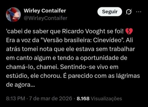 (Ontem, 09:17 )Johnny545 Escreveu: O Wirley Contaifer comentou sobre o falecimento do Ricardo Vooght, revelou que ele não estava recebendo trabalho de dublagem de nenhum estúdio quando estava vivo e chorou quando recebeu um convite do Wirley.