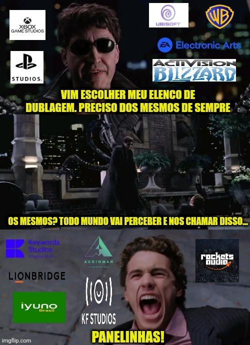 (10-10-2025, 20:40 )Duke de Saturno Escreveu:(10-10-2025, 13:05 )Diego brando Escreveu:(10-10-2025, 12:33 )GiovanniTav Escreveu: Battlefield 6 foi na Rockets Audio, direção do Marco Nepomuceno (10-10-2025, 20:46 )Diego brando Escreveu:(10-10-2025, 20:40 )Duke de Saturno Escreveu:(10-10-2025, 13:05 )Diego brando Escreveu:(10-10-2025, 12:33 )GiovanniTav Escreveu: Battlefield 6 foi na Rockets Audio, direção do Marco Nepomuceno KF Studios é de POA, é outro elenco totalmente diferente dos demais. Mas, o meme é criativo, achei engraçado. Para ficar mais realista, só trocaria justamente a KF pela ANZ Immersive Audio. (10-10-2025, 19:26 )Faustek Escreveu:(03-10-2025, 00:33 )SuperBomber3000 Escreveu: Como eu falei antes, pode ser que o fato de ser game acabe ajudando um pouco nesse caso, já que a maioria das reclamações trabalhistas referentes ao estúdio envolvem dublagem tradicional, e dublagem de game é quase que considerada outra coisa pelo mercado, as exigências para se dirigir dublagem de game são diferentes e a remuneração aos dubladores também é.A julgar pelo resto do elenco de Ghost of Yotei: não kkkkkk Eu olhei lá o elenco na Wiki, quem adicionou o Giraldi entre as vozes adicionais errou. De fato, provavelmente o meu palpite estava errado e, os elencos do estúdio com games devem seguir o padrão das demais mídias já feitas lá. Achei o elenco de Ghost of Yotei como um todo bom, mas como falei antes, uma coisa é a Atma pegar um jogo grande de forma muito esporádica vez ou outra, outra coisa é ela vir a se tornar uma concorrente do gênero com a Keywords, a Rockets, a Audioman e os demais estúdios especializados no gênero. Podem reclamar o que for dos estúdios paulistas que fazem game de forma usual, mas eles não tem as mesmas restrições de elenco, tanto que quando precisa chamar gente de fora da "panela", eles chamam sem problemas.