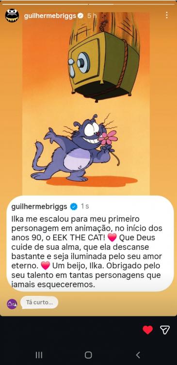 Guilherme Briggs lamentou o falecimento da Ilka em seu Instagram e falou sobre de como ele conseguiu o primeiro principal das animações na VTI em Eek the Cat! por causa da Ilka