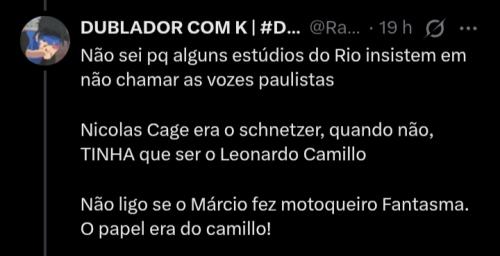 O jogo Marvel Tokon Fighting Souls receberá dublagem em português. Fonte: https://blog.br.playstation.com/2026/02/...de-agosto/ (13-02-2026, 00:55 )Bruna Escreveu: Gente, é só assistir alguns segundos do trailer e aparece o Nicolas Cage. Não querendo ser grosseiro, mas parece que o camarada alí só viu a capa do trailer e já veio perguntar. (13-02-2026, 02:02 )crbzxd Escreveu: Acho que vale a pena mencionar aqui também, já que se trata de uma produção da Marvel. Interessante, provavelmente não irão seguir as escalas dos filmes né? (13-02-2026, 06:33 )JAXK Escreveu:O Johnny postou a versão dublada, eu realmente não vi o trailer no idioma original, e como é uma produção diferenciada, pensei que poderiam ter chamado um voice actor de timbre semelhante (tipo Antonio Banderas e Eric Bauza no Gato de Botas)(13-02-2026, 00:55 )Bruna Escreveu: Gente, é só assistir alguns segundos do trailer e aparece o Nicolas Cage. (13-02-2026, 06:33 )JAXK Escreveu:(13-02-2026, 00:55 )Bruna Escreveu: Gente, é só assistir alguns segundos do trailer e aparece o Nicolas Cage. É um novo formato, novas vozes serão bem vindas, mas também não vou reclamar se quiserem manter escalas dos filmes. |